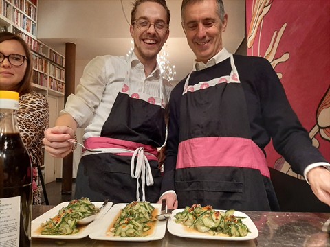 Sven, van VOKA, kwam voor de vierde keer bij ons. Dit keer koos zijn jong en dynamisch team voor de snelle versie van een quick lunch. Een twee uur durende kookworkshop waarbij de nadruk ligt op snel klaar te maken gerechten, die energie geven, gezond zijn en eventueel geschikt om mee te nemen naar het werk. Na de lunch spurtte het team de deur uit, op naar een volgende activiteit.